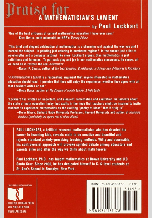 A brilliant research mathematician who has devoted his career to teaching kids reveals math to be creative and beautiful and rejects standard anxiety-producing teaching methods. Witty and accessible, Paul Lockhart's controversial approach will provoke spirited debate among educators and parents alike and it will alter the way we think about math forever.