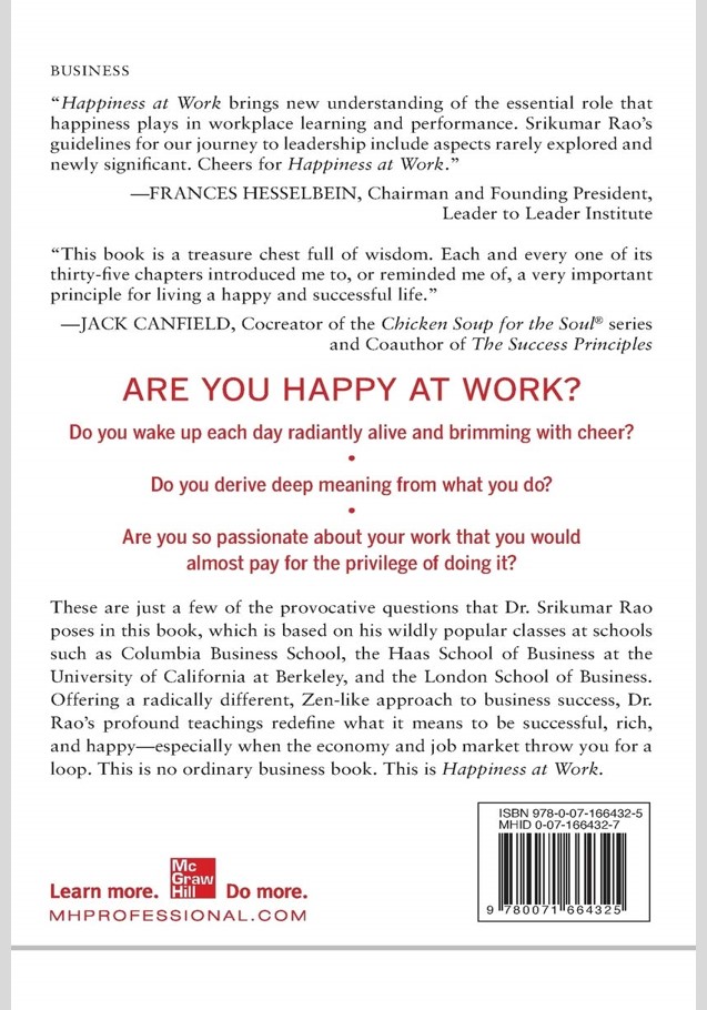 "In these tough times, there are few people who are completely happy with the current conditions. From business executives to the everyday Joe or Jane, everyone seems to be going through a rough economic and personal crunch. But acclaimed business school Professor Srikumar Rao says that we can learn to create joy no matter what else may be going on around us. Rao shows you that it isn't the negative thing that happens to you that causes your unhappiness, it's how you see it. Happiness at Work is a thought-provoking new title that moves the mind away from negativity and forces you to resist labeling situations as ""bad"", but rather seeing them as neutral."