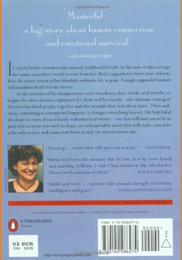 The Deep End of the Ocean by Jacquelyn Mitchard centers around the kidnapping of a three-year-old boy, Ben and its effects upon his family. He is abducted from a crowded Chicago hotel lobby where his mother, Beth Cappadora, takes him and his two siblings for her high-school reunion. Beth tries every possible thing before she accepts the truth that Ben is not coming back. Beth goes into a terrible emotionless state in which she neglects her surviving two children - oldest child Vincent and a baby daughter, Kerry. After nine years have passed, a miracle happens: Beth opens her door to find a boy. Read it for an engaging story of traumatic loss and its effects on individuals and families, about motherhood and family relationships.