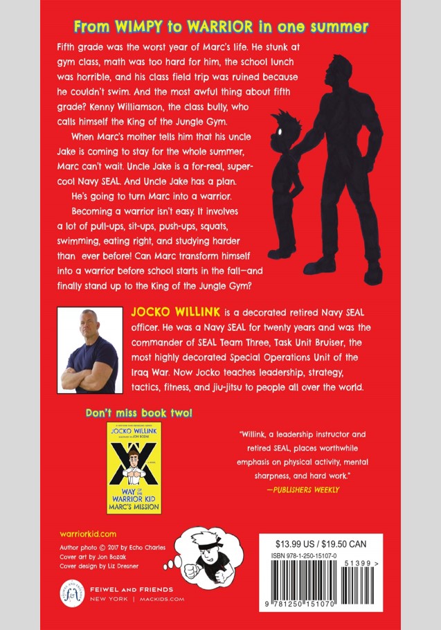 Fifth grade was the worst year of Marc's life. He stunk at gym class, math was too hard for him, the school lunch was horrible, and his class field trip was ruined because he couldn't swim. But what was most awful thing about fifth grade? Kenny Williamson, the class bully, who calls himself the King of the Jungle.When Marc's mother tells him that his Uncle Jake is coming to stay for the whole summer, Marc can't wait. Uncle Jake is a for real, super-cool Navy SEAL. And Uncle Jake has a plan.He's going to turn Marc into a warrior.Becoming a warrior isn't easy. It means a lot of pull ups, sit ups, pushups, squats, swimming, eating right, and studying harder than ever before! Can Marc transform himself into a warrior before school starts in the fall - and finally stand up to the King of the Jungle himself?The Way of the Warrior Kid is a new illustrated chapter book by #1 New York Times-bestselling author and retired Navy SEAL Jocko Willink.